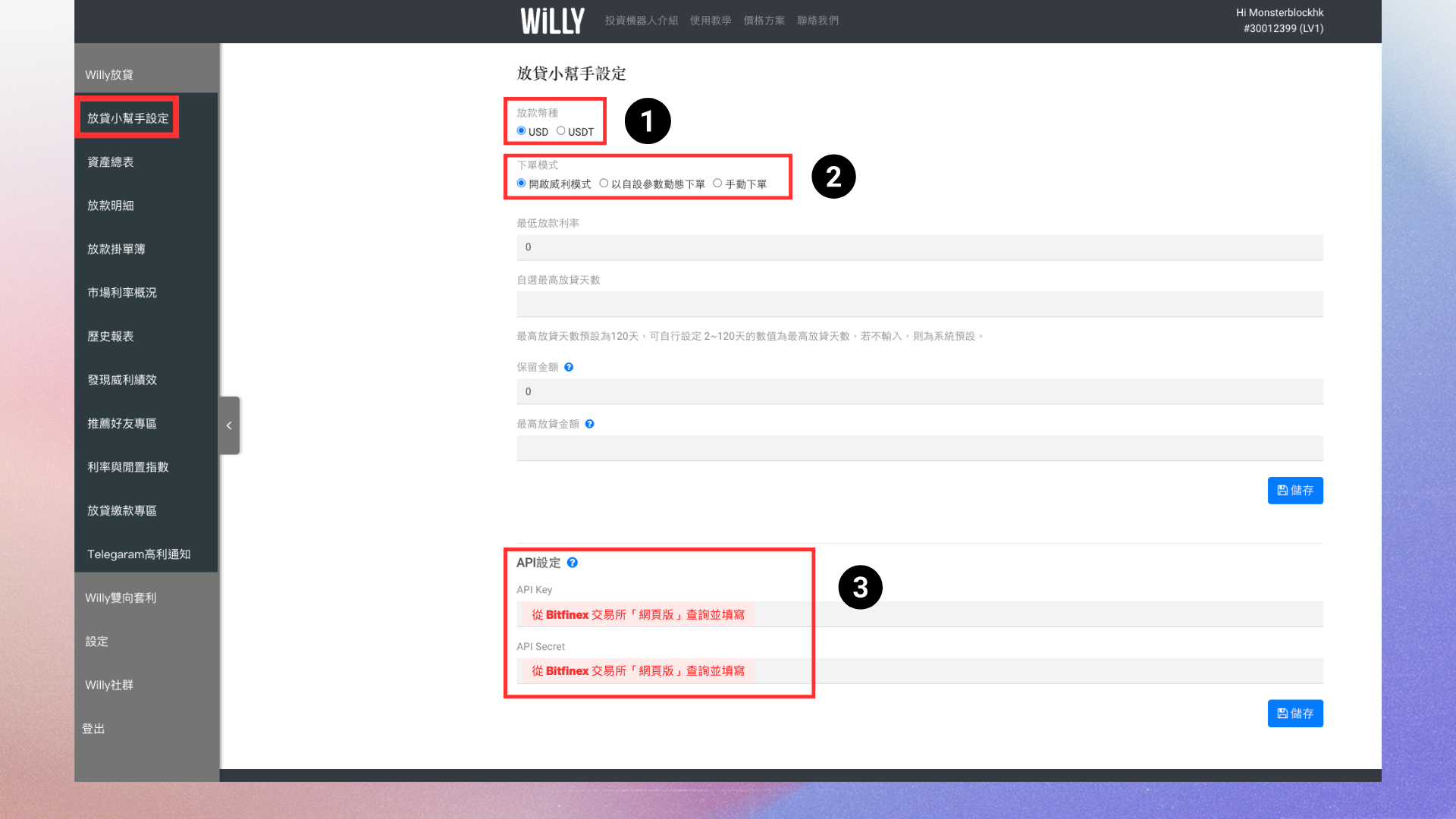 Step 4:設定 API 串接 Bitfinex 與 Willy