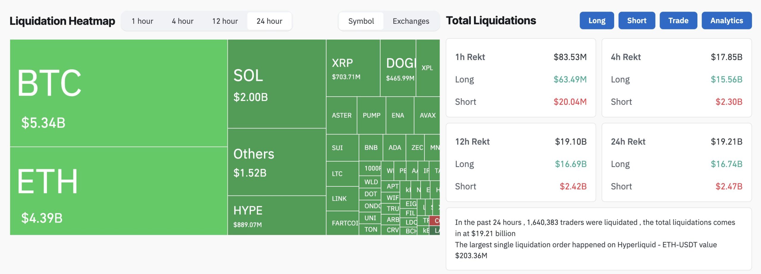 許多交易員將行情暴跌歸因於兩方面因素:一是特朗普突發的新關稅消息引發市場恐慌性拋售,風險資產集體遭拋售使加密貨幣成為重災區;二是近期幣價連續上漲後積累了大量槓桿多頭倉位,一旦下跌觸發連鎖強制平倉,進一步放大了跌幅。據衍生品數據網站 Coinglass 統計,過去一天內加密市場爆倉(金額)高達70億美元以上,部分行情監測機構的估計甚至達到90億美元。大量高槓桿合約被強制平倉,加速了價格下探的深度和速度。