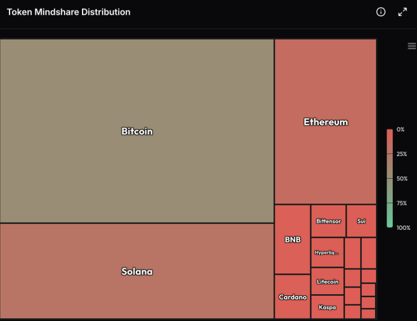過去 7 日代幣 mindshare 結構延續前幾週的集中與收縮趨勢。圖中顯示,比特幣仍佔據最大區塊,約落在 50%–70% mindshare 區間,穩居市場注意力核心;以太坊為第二大主體,但占比明顯小於 BTC。Solana 雖仍保有可見面積,但相較高峰期已顯著收斂。其餘主流代幣如 BNB、Cardano 等,相對佔極小比例,整體呈現高度碎片化且偏深紅色,反映多數資產的 mindshare 於一週內持續下滑。整體版圖幾乎沒有新增敘事放大,顯示市場注意力正從加密資產全面撤離。 這種 mindshare 流失並非單點事件,而是跨市場風險偏好轉移的結果。在宏觀不確定性持續偏高的背景下,資金與討論熱度更多流向黃金與白銀等稀有金屬,形成與加密市場的明顯對比。當 crypto 僅剩 BTC 與少數高共識資產仍被討論,其餘板塊全面失聲,往往意味情緒已接近低潮。從歷史週期看,mindshare 大幅低於基本面與長期敘事時,反而構成估值層面的反向訊號。當市場選擇忽視整個資產類別,而非僅個別代幣時,代表情緒定價已過度悲觀,為後續風險資產重新獲得關注預留了空間。