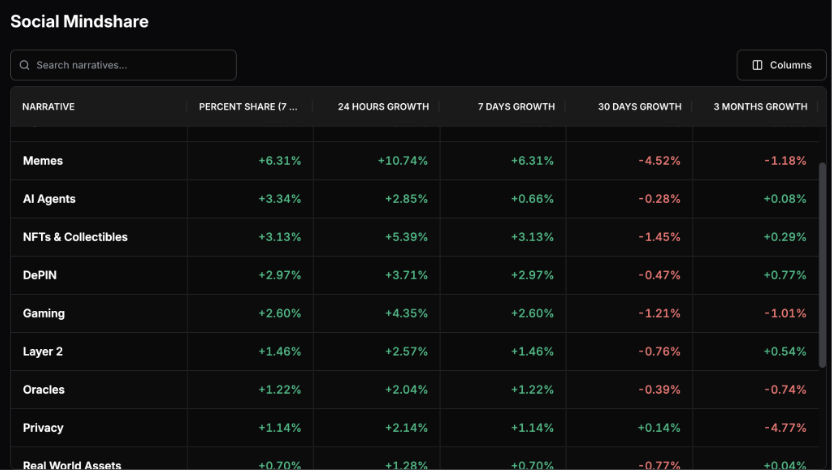 過去 7 日社交 mindshare 結構出現明確的敘事分化,Memes 以 6.31% 的 7D mindshare 佔比居於首位,並錄得 +10.74% 的 24H 成長與 +6.31% 的 7D 成長,成為目前最具討論度的板塊。相較之下,AI Agents 僅佔 3.34%,7D 成長 +0.66%,NFTs 與 Collectibles 為 3.13%,DePIN 為 2.97%,Gaming 為 2.60%,其餘如 Layer 2 與 Oracles 均低於 1.50%。值得注意的是,多數板塊在 30D 維度仍為負值,例如 Memes 為 -4.52%,Gaming 為 -1.21%,顯示近期熱度更偏向短期集中爆發,而非中期敘事回流。 這種由 Memes 領跑的 mindshare 結構,反映市場正進入高度情緒化且「全有或全無」的討論狀態。在整體流動性不足、主流資產價格缺乏趨勢的背景下,投資者更傾向將注意力投向高波動、低門檻、即時反饋強的敘事,以換取短線刺激與博弈機會。Memes 的 mindshare 上行,本質上並非風險偏好全面回暖,而是資金與注意力在缺乏方向時的替代性宣洩。歷史經驗顯示,當社交 mindshare 由情緒型敘事主導而非基本面敘事時,價格波動往往被放大且持續性偏弱,對短線交易者而言機會與風險並存,而對中長線配置則更需要保持節奏與紀律。