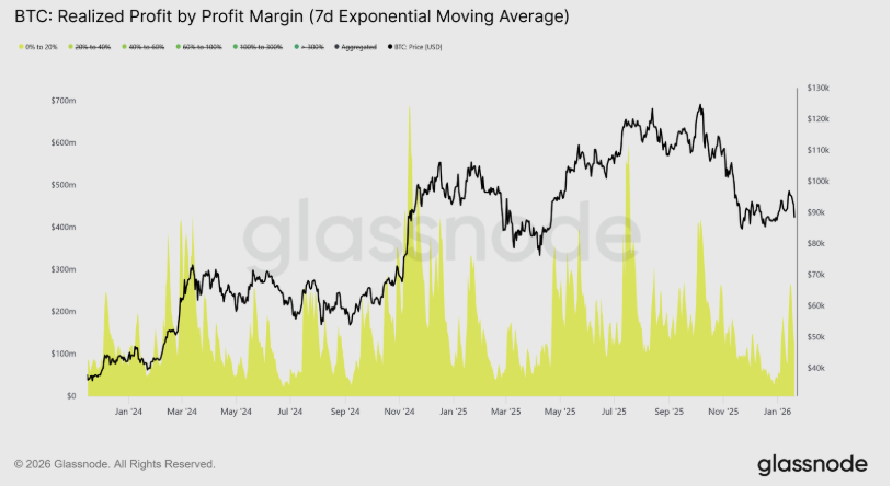 圖中顯示,已實現利潤中來自 0% 至 20% 利潤區間的占比明顯上升,成為近期價格走強時的主要供給來源。這代表大量資金選擇在接近成本基準的位置快速了結,而非承擔趨勢延續的不確定性。此類行為多由回本賣方與短線交易者主導,反映市場參與者在當前階段更重視資本保全而非放大利潤。結構上,薄利即出的供給在價格每次反彈時即被釋放,持續限制上行斜率,顯示流動性並未真正轉向風險承擔,而仍停留在防禦狀態。 在低利潤了結持續主導的環境下,市場整體風險承受度明顯偏低,意味新增流動性難以在短時間內大規模進場。即使價格出現階段性反彈,其本質更接近結構性修復而非全面趨勢反轉,貿然重倉或一次性投入將放大回撤風險。此一格局提示投資策略需以時間換取結構改善,透過分批配置與嚴格倉位管理應對長期盤整。市場距離情緒全面修復仍有相當距離,耐心與節奏控制將比方向判斷更為關鍵,唯有等待風險偏好實質回升,流動性條件才可能支持更持久的上行行情。