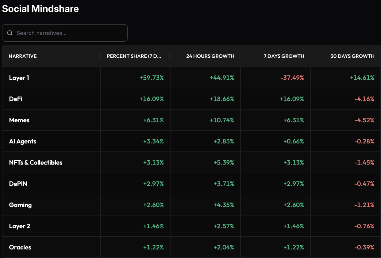 過去一週社交 mindshare 明顯向大型板塊集中,Layer 1 以 59.73% 的 7D mindshare 佔比居於絕對主導地位,即使其 7D 成長為 -37.49%,仍遠高於其他任何敘事。DeFi 以 16.09% 居次,而其餘板塊,比如 NFTs、DePIN 和 Gaming皆處於邊緣區間。數據顯示,雖然多數板塊在 24H 內出現反彈,例如 Layer 1 24H 成長 +44.91%、DeFi +18.66%,但週期層級的注意力仍高度集中於少數大型敘事,整體結構偏向收斂而非擴散。 這種 mindshare 集中反映的是市場信心不足下的理性選擇,而非單純的話題輪動。在行情疲弱、價格缺乏趨勢且宏觀不確定性未解的環境中,投資者更傾向討論與關注高市值、高流動性、具長期共識的資產,而非中小型或高風險敘事。Layer 1 特別是 Bitcoin 與 Ethereum 成為討論核心,本質上是市場在防禦模式下尋找敘事錨點的結果。