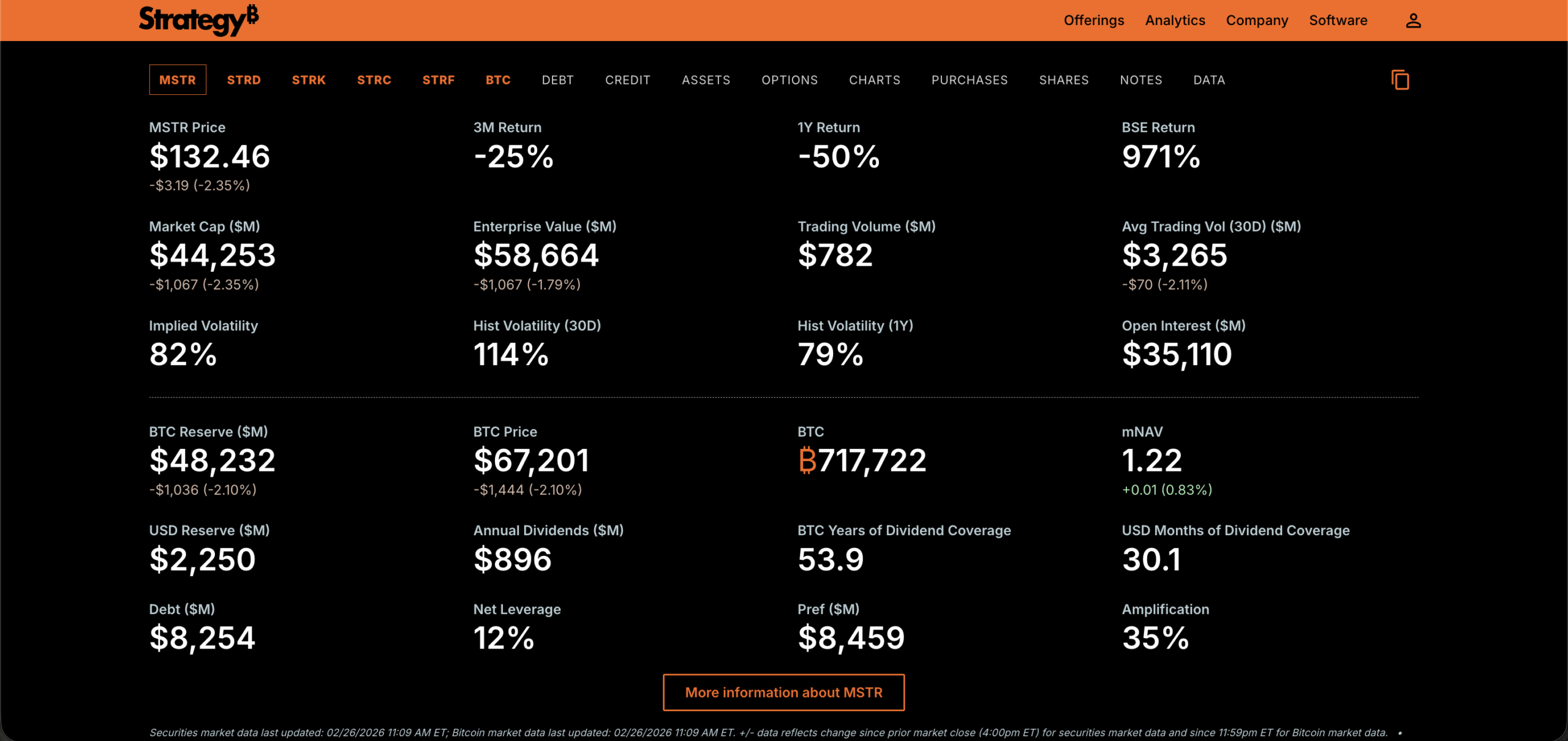 mNAV 是這個策略的關鍵指標,它等於公司市值除以(比特幣市值減去債務再加上現金)。當 mNAV 大於 1,代表市場願意為 MSTR 支付溢價,此時融資買幣對現有股東是「增值」的;反之,如果 mNAV 小於 1,融資就會變成「稀釋」的,每股比特幣持有量反而減少。截至 2026 年 2 月 25 日,Strategy 的 mNAV 為 1.22,仍然處於相對安全的區間,但過去幾個月曾經短暫跌破 1,股價也因此大跌超過 65%(自 2025 年 10 月高點算起)。