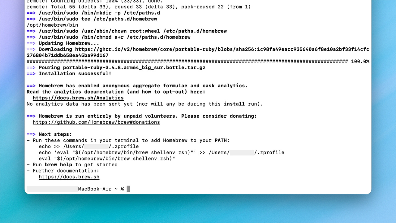 echo ‘eval “$(/opt/homebrew/bin/brew shellenv)”‘ >> ~/.zprofile eval “$(/opt/homebrew/bin/brew shellenv)”