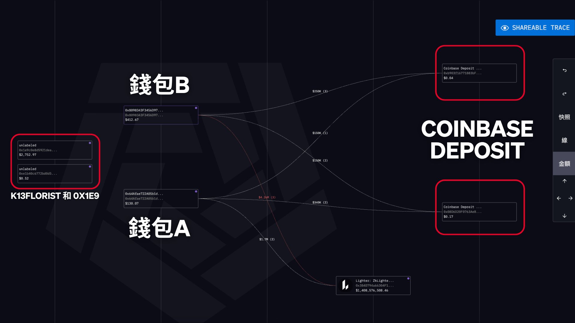 更具體來說,在這個案例中,我們發現錢包 A(@k13florist 的外部地址)和錢包 B(@0x1E9 的外部地址)都曾向同一個地址 0xb903f1…7A817Ee9 發送資金,而這個地址明確被標註為 Coinbase 的充值位址。