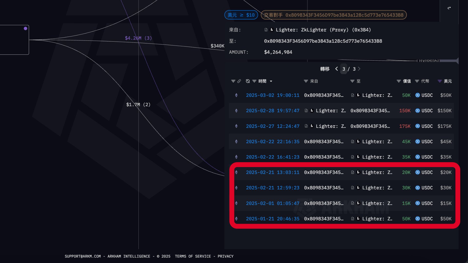 但就算不使用付費工具,前面幾步的分析其實已經足以揭示許多關鍵證據。像我們這次以 Lighter 為例,透過上圖 Arkham 的圖譜分析,還發現一個非常關鍵的時間點,錢包 B 曾在 2025 年 1 月 21 日向 Lighter 智能合約發送資金。