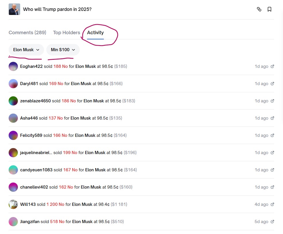 在 Polymarket 的市場頁面中,往下滑到「Activity」區段後,建議先設定一些篩選條件,像是設定最小下注金額(例如 $10 或 $100),這樣可以過濾掉零碎的小單,將重點放在下注較大的用戶。接著可以特別觀察那些在低機率選項(例如 30% 或更低)上投入大量資金的帳號。