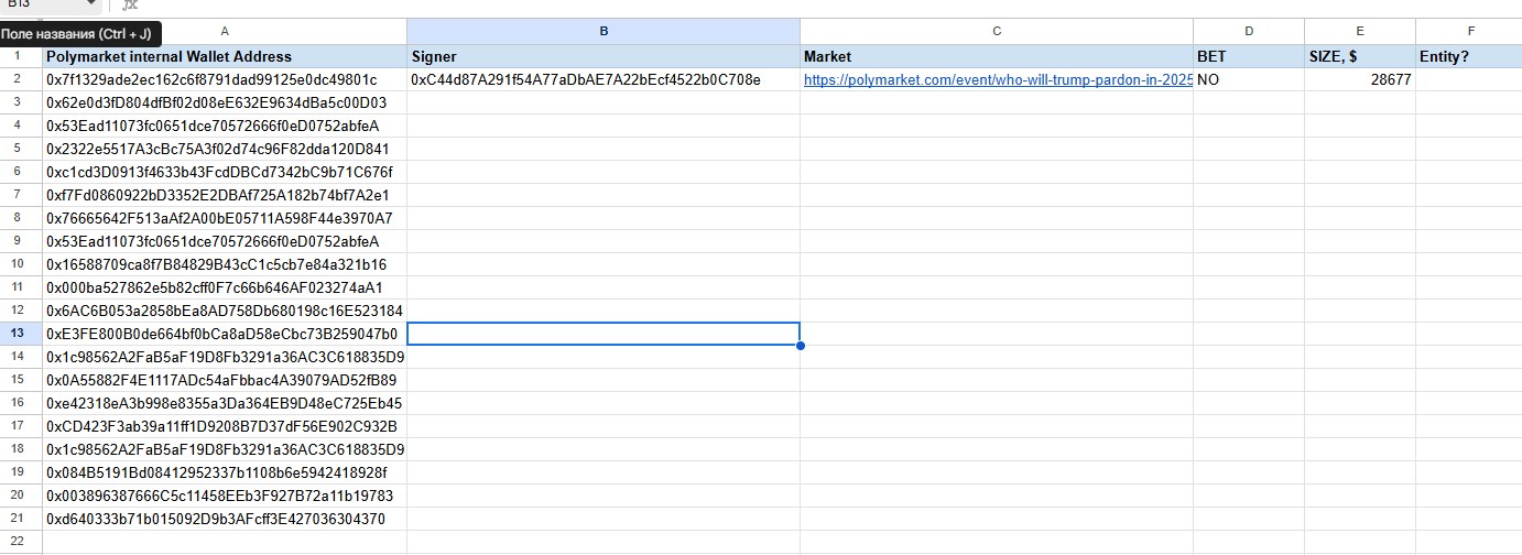 一旦鎖定幾個有嫌疑的帳號,大家可以把他們的 Polymarket 地址、下注記錄、投注金額等資訊整理起來,丟進一份 Google Sheet 裡,為後續進行鏈上追蹤準備好清單。 這時就可以進入真正好玩的部分。