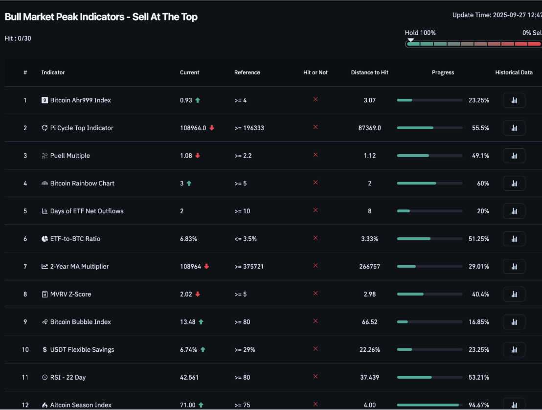 根據 9 月 27 日最新的 Bull Market Peak Indicators 數據,30 項頂部指標仍無一觸發,系統維持 100%「持有」。其中,Altcoin Season Index 為 71,距離臨界值 75 僅差 4 點,進度高達 94.67%,顯示山寨幣熱度逼近關鍵區間;比特幣 Ahr999 指數僅 0.93,距離高點仍逾 3,進度僅 23.25%,市場尚未過熱。其他核心指標如 Pi Cycle Top(55.5%)、Puell Multiple(49.1%)、RSI(53.2%)均保持在中性至偏高水位,暗示漲勢延續但仍屬可控。整體而言,市場情緒並未觸發泡沫警訊,而是處於健康且偏謹慎的繁盛階段。 這樣的分布意味短期雖無明顯崩盤風險,但山寨幣指標逼近臨界值,卻並未真正突破,暗合「山寨季可疑未立」的情境。伴隨市場恐懼與觀望情緒回流,資金分佈更顯保守,亦印證牛市進程仍處於中段,而非末端狂熱。對投資人而言,當前並非盲目 FOMO 的時機,而是透過逢低加倉、拉低持倉均價的合理區間,將前期落袋獲利再投入,為下一波行情建立安全緩衝。畢竟,真正的高位訊號尚未點亮,理性配置比情緒追漲更能決定誰能在波動中持續保有主動權。