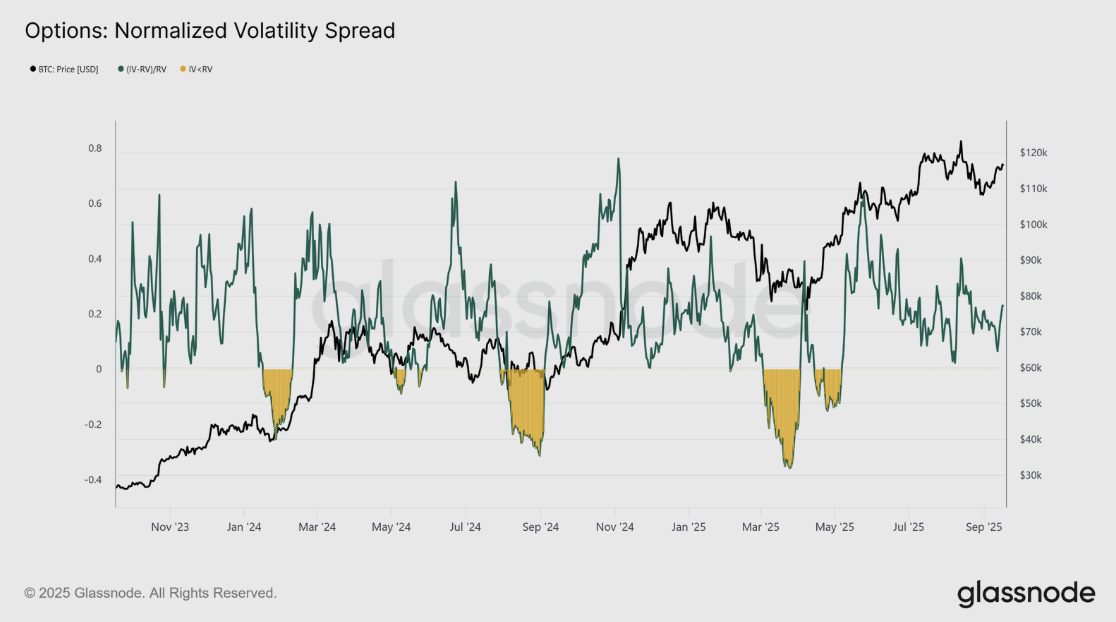 期權市場數據顯示,隱含波動率長期貼近實現波動率,但於 FOMC 會議前夕出現明顯抬升,反映市場參與者積極加碼長 Gamma 部位以對沖不確定性。最新的一個月標準化利差穩定於 0.228,雖仍在常態區間,卻已顯示做市商在承擔風險時要求更高溢價。從圖表可見,自 2024 年以來,波動率利差每逢大幅飆升後,往往伴隨比特幣價格短期急動,顯示槓桿情緒在宏觀事件驅動下的放大效應。 波動率上行的本質在於市場進入「風險放大器」階段,任何消息或宏觀變數均可能觸發價格急升或急跌。在這樣的 risk-on 環境,高風險與高回報並存,交易者雖可透過槓桿與期權工具獲取超額收益,但同時亦面臨加速清算的風險。對投資者而言,理性鎖定部分獲利、保持倉位彈性,遠比盲目追逐短期波動更為關鍵。畢竟,未落袋的收益僅是帳面數字,唯有在波動周期中謹守紀律,方能確保長期存續與穩定增值。