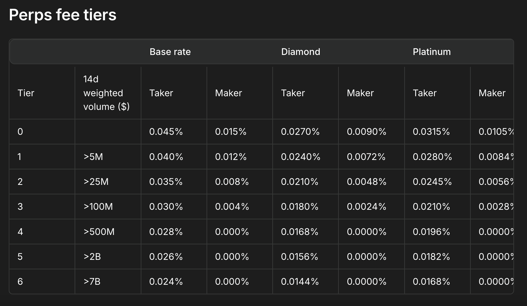 默認吃單(Taker)費率約 0.045%,掛單(Maker)費率 0.015%。隨交易量提升還可進入更優惠的費率階梯,如大戶費率可低至 0.027%/0.009% 或更低。