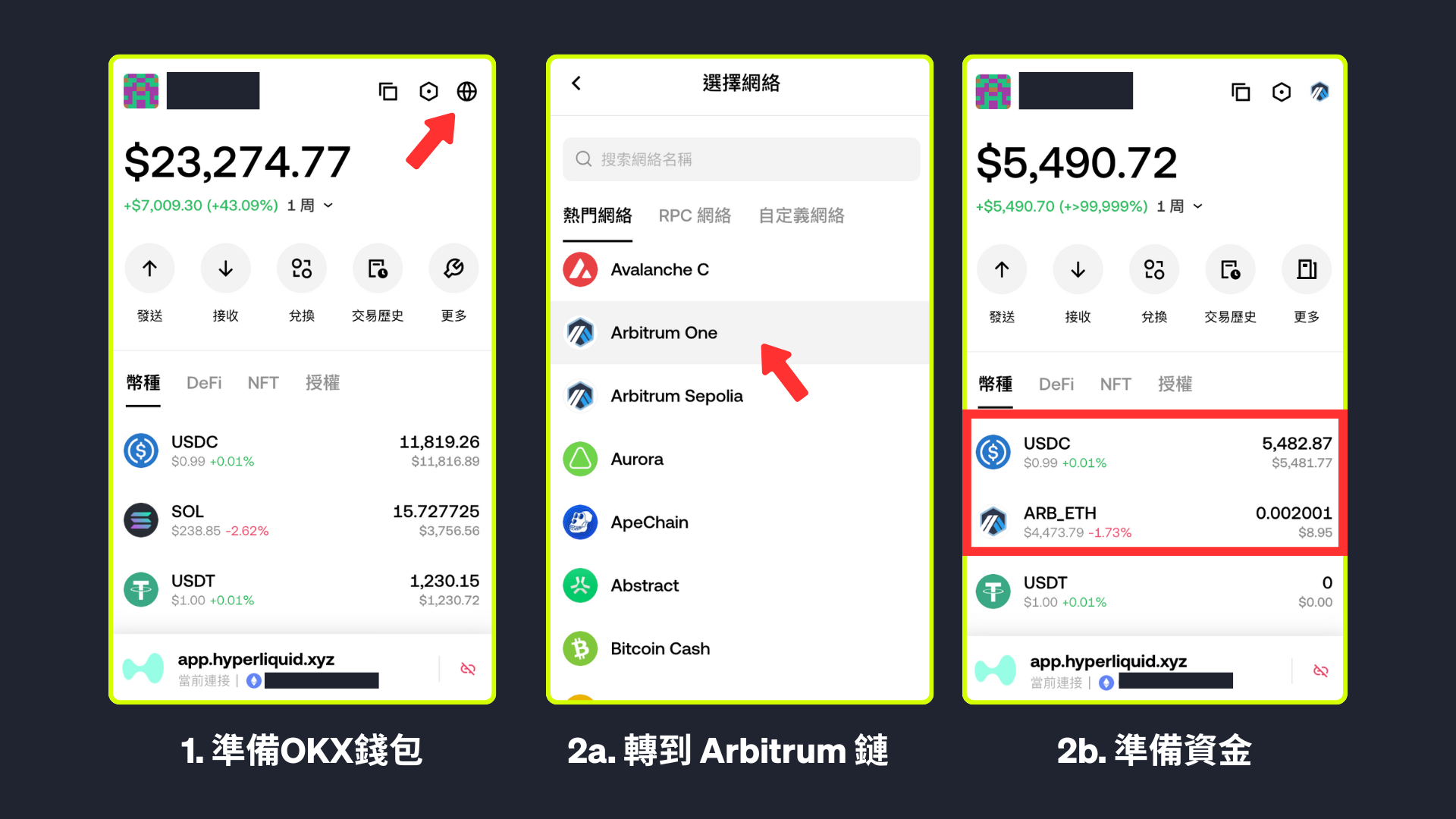 2a. 在 OKX 錢包右上角按 Icon 轉到 Arbitrum 鏈。
